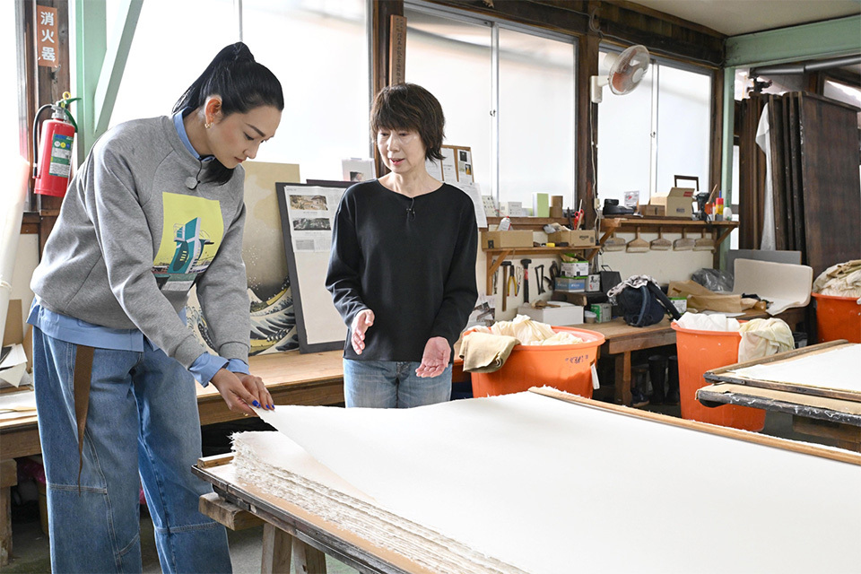 さらに愛さんが名人に教わりながら「紙漉き」に挑戦!